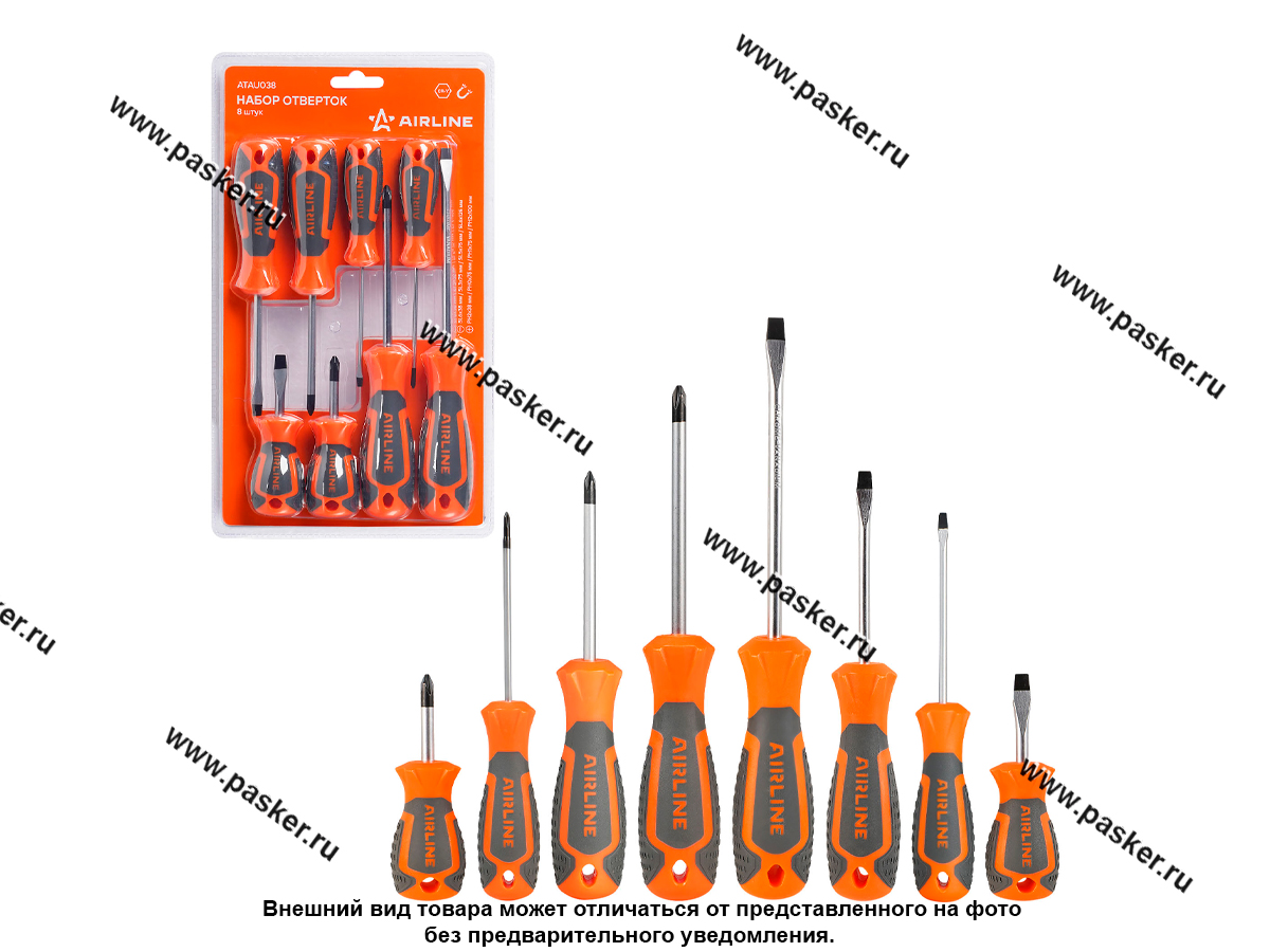 Сочетание твёрдых и мягких элементов рукоятки оптимально распределяет усилие, прилагаемое к инструменту, и предотвращает проскальзывание. Эргономичный дизайн облегчает работу. Отвёртки AIRLINE удобно подвешиваются за специальное отверстие. Лезвие отвёрток AIRLINE изготовлено из хром-ванадиевой стали, жало подвержено индукционной закалке и фосфатировано. Наконечник отвёртки намагничен.