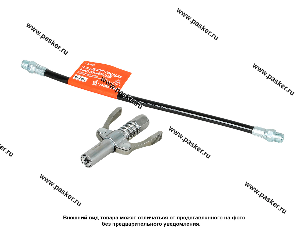 Комплект Наконечник-насадка быстросъемный для плунжерного шприца, со шлангом 300мм нейлоновым (ATGG555) — идеальное решение для удобного и эффективного обслуживания оборудования, агрегатов и узлов. Ключевой особенностью насадки на шприц является наличие специальных рычажков, которые значительно ускоряют процесс присоединения и отсоединения от пресс-масленки. Для установки достаточно нажать на рычажки и зафиксировать наконечник на пресс-масленке. Демонтаж осуществляется аналогичным образом: нажатием на рычажки и аккуратным отсоединением. Такая конструкция наконечника позволяет минимизировать временные затраты и повысить производительность работ при использовании шприца для смазки. Шланг для плунжерного шприца нейлоновый 300мм (ATGG550), входящий в комплект - предназначен для подачи смазки из шприца к наконечнику. Изготовленный из высококачественного нейлона, шланг AIRLINE сочетает в себе прочность, гибкость и устойчивость к изгибам, что делает его идеальным для использования в различных условиях.