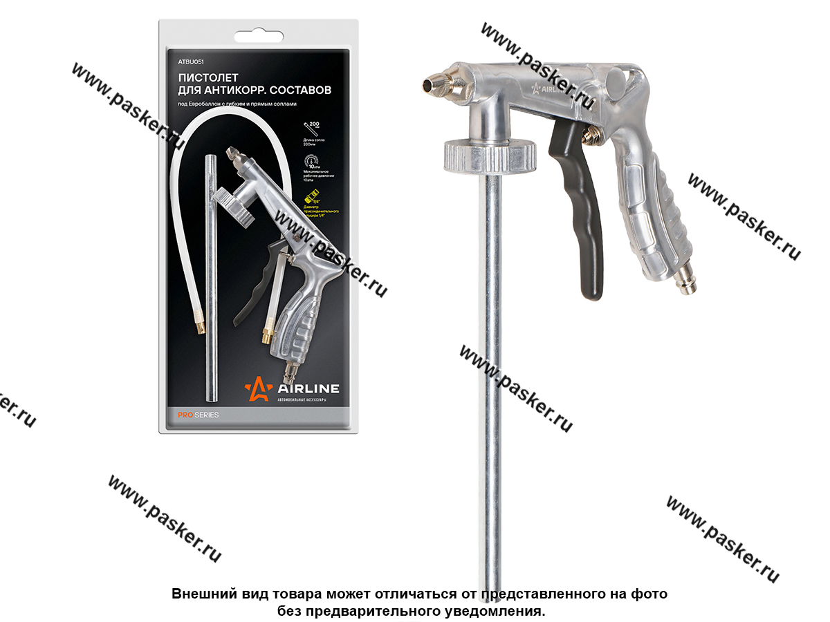 Пистолет изготовлен из металла. Имеет стандартное присоединение под евробаллон и дополнительное гибкое сопло для нанесения составов в скрытых полостях и труднодоступных местах.